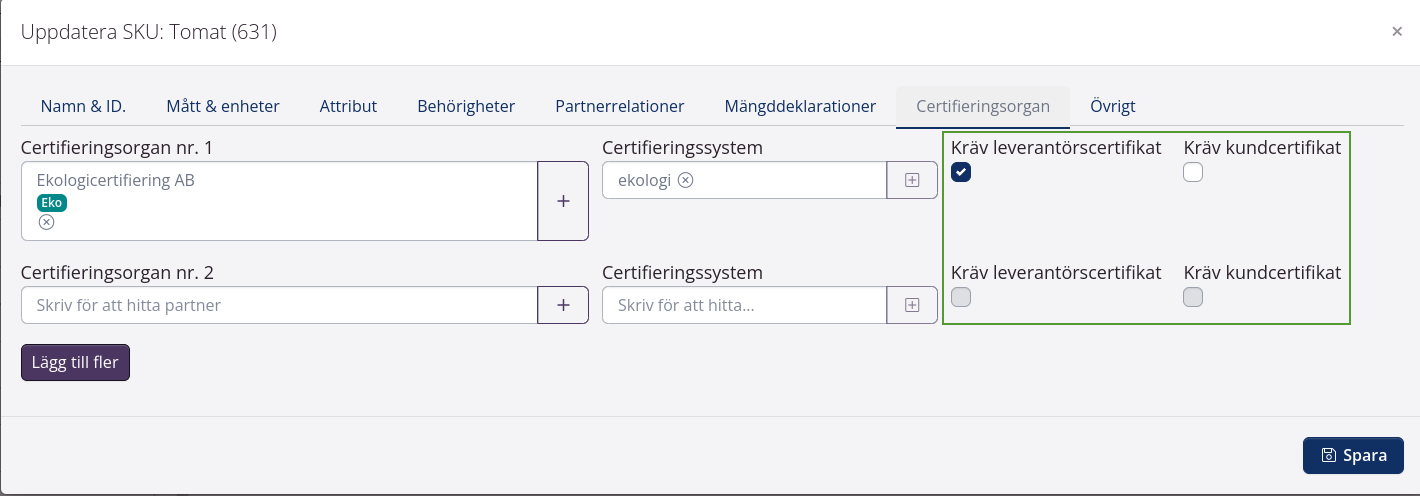 Du kan nu kräva leverantörs- eller kundcertifikat på artiklar. Denna inställning gör att du inte kan skapa inköps- eller försäljningsordrar utan ett giltigt certifikat. Du ska ha tillägget Uppgifter & Kontroller för att använda funktionen.