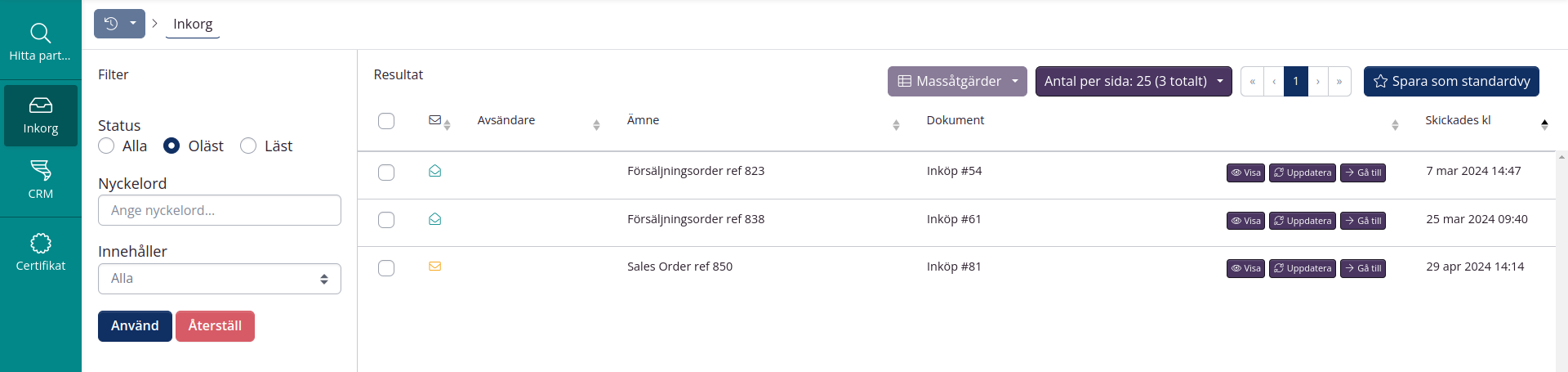 Du kan även slå till tillägget Inkorg i Företagsinställningar. Då vill du kunna ta emot orderbekräftelser från dina samarbetspartners i inkorgen.
